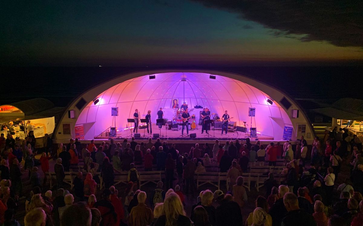 Die Sylter MEMORIES 2024 an ihrer festen Spielstätte – in der Westerländer Musikmuschel auf Sylt | v.l.n.r. Emanuel Frenczel Posaune – Samuel Frenczel Trompete – Bertalan Frenczel Trompete – Ralf Brauckhoff Schlagzeug – Alexander Schick Rhythmusgitarre & Gesang – Mario Andresen Bass – Bernd Pahlke Leadgitarre
